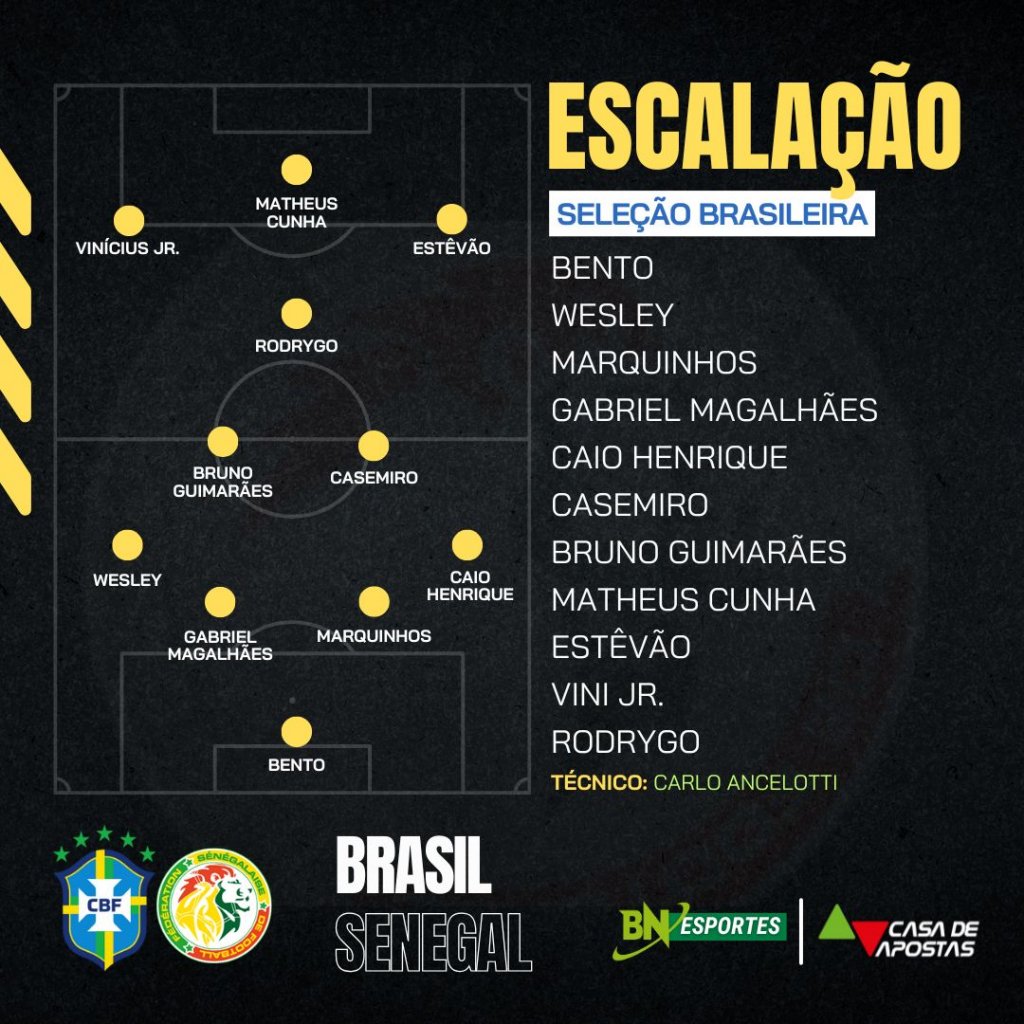 Diante das novas opções, a provável escalação da equipe brasileira deve ser composta por: Bento; Wesley, Marquinhos, Gabriel Magalhães e Caio Henrique; Casemiro, Bruno Guimarães e Matheus Cunha; Estêvão, Vini Jr. e Rodrygo.