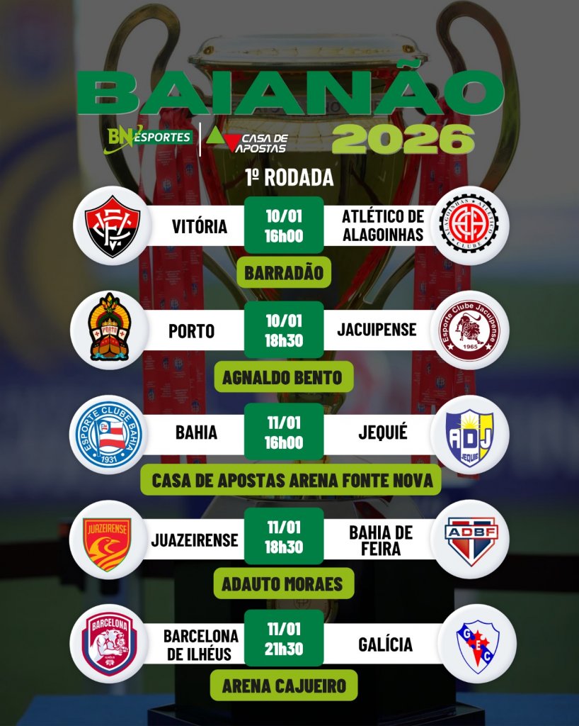 Confrontos da primeira rodada do Campeonato Baiano 2026 | Arte: Arte: Alana Dias/Bahia Notícias