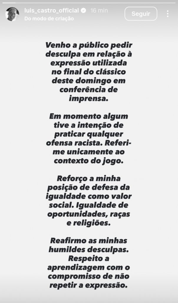 Diante da repercussão, o comandante gremista utilizou suas redes sociais para se manifestar e pedir desculpas pelo termo empregado, ressaltando que não houve qualquer intenção de cunho racial ou ofensivo em sua fala.
