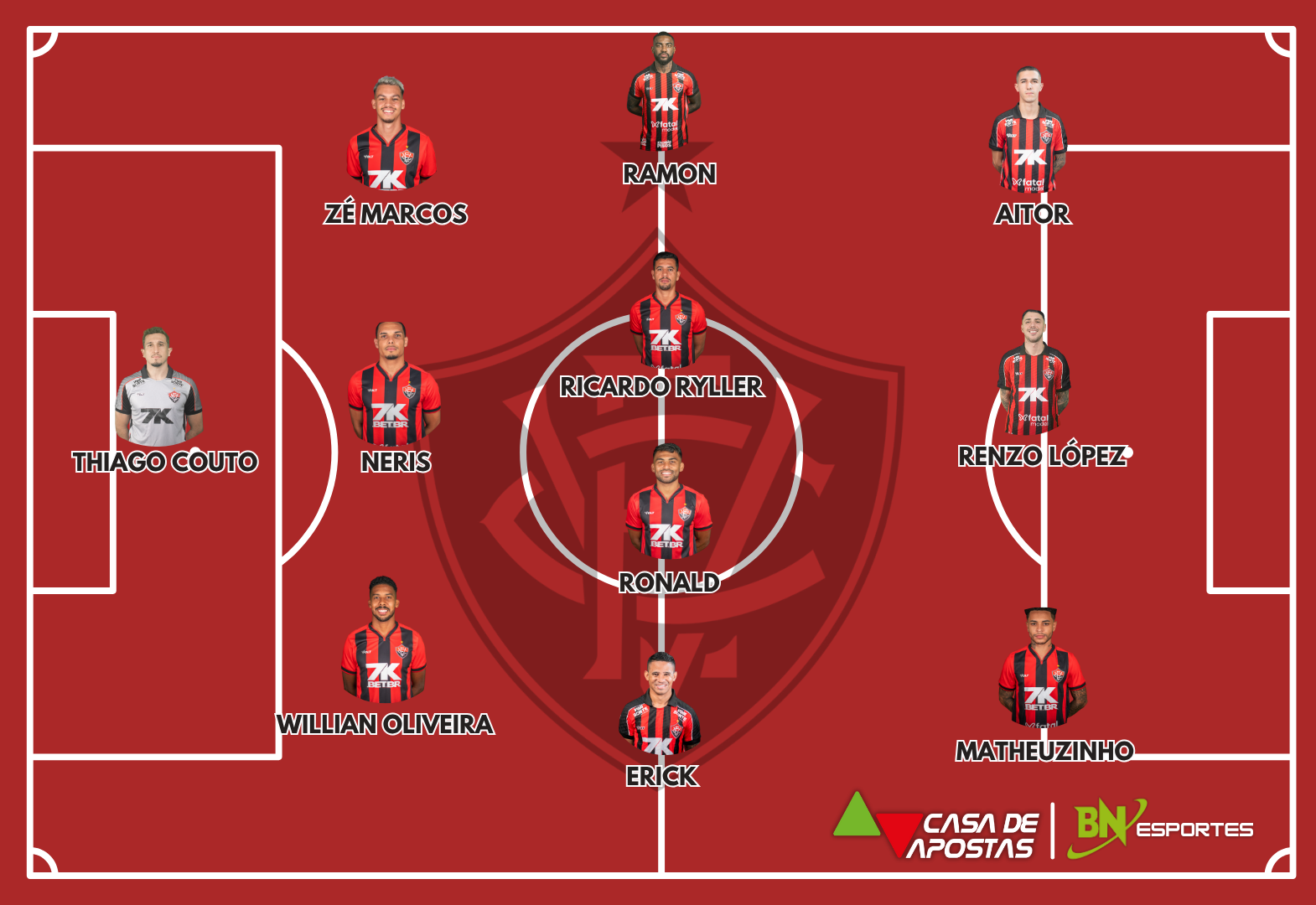 Vitória: Thiago Couto; Willian Oliveira (Kauã Coutinho), Neris e Zé Marcos; Erick, Ricardo Ryller, Ronaldo e Ramon; Matheuzinho, Aitor Cantalapiedra e Renzo López (Renato Kayzer). Técnico: Jair Ventura.